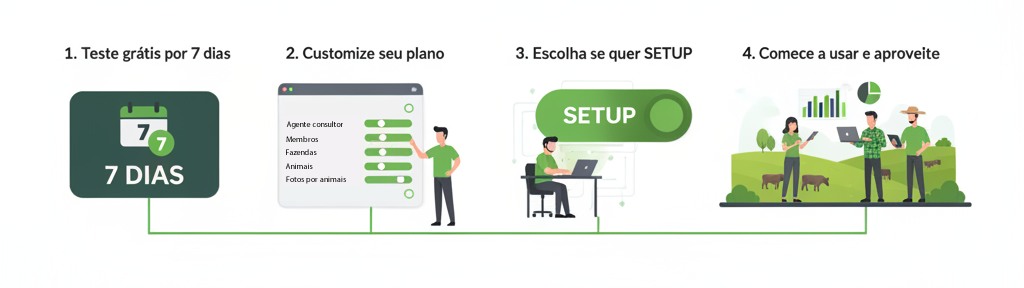 1. Você escolhe o plano e define os limites nos controles de: Agente consultor, Membros, Fazendas, Animais e Fotos por animal.